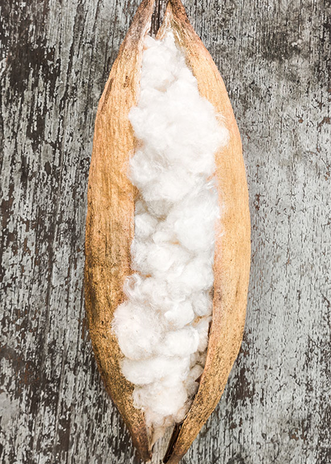 Kapok ist die seidig weiche und extrem leichte Hohlfaser des tropischen Kapokbaumes. Sie isoliert hervorragend, ist antimikrobiell und hypoallergen und durch ihre natürliche Wachsschicht wasserabweisend.